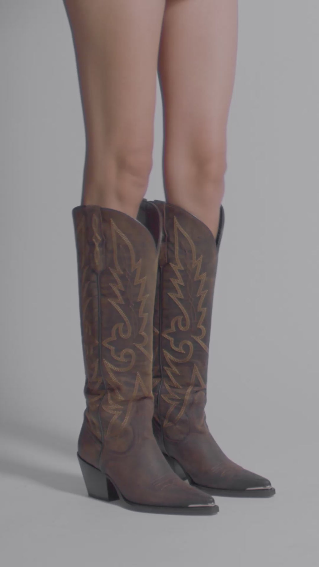 Esta bota knee-high estilo western fusiona la profundidad de la piel con el carácter audaz de su puntera metálica, revelando una estética sofisticada y poderosa. Confeccionada en piel color café, el acabado metálico aporta un acento contemporáneo que crea un contraste elegante entre tradición y modernidad. Su tacón de 7.5 cm estiliza la silueta con naturalidad, aportando presencia y seguridad en una pieza que se impone por su diseño, su fuerza visual y su identidad atemporal.